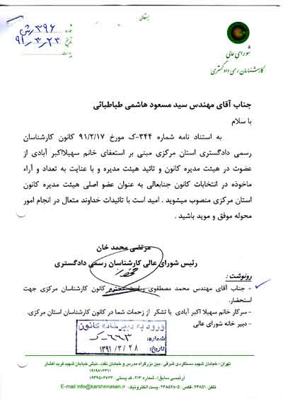 با توجه به استعفای خانم سهیلا اکبرآبادی، رییس شورای عالی کارشناسان رسمی دادگستری، طی حکمی آقای سید مسعود هاشمی طباطبائی را بعنوان عضو اصلی هیئت مدیره منصوب نمودند. متن حکم به شرح زیر است: