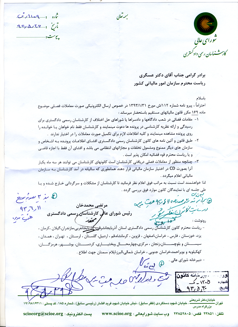 نامه ای از شورایعالی کارشناسان رسمی دادگستری در خصوص موضوع فوق به کانون استان مرکزی رسیده که عینا منتشر میشود و با کلیک قابل ملاحظه است:
