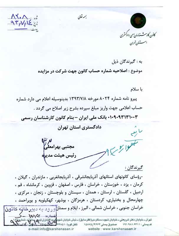 کانون کارشناسان رسمی دادگستری استان تهران طی نامه ای نسبت به تصحیح شماره حساب اعلام شده درنامه شماره 8024 مورخ 1393/07/08 اقدام نموده؛ که نامه عیناً منتشر و با کلیک قابل ملاحظه میباشد