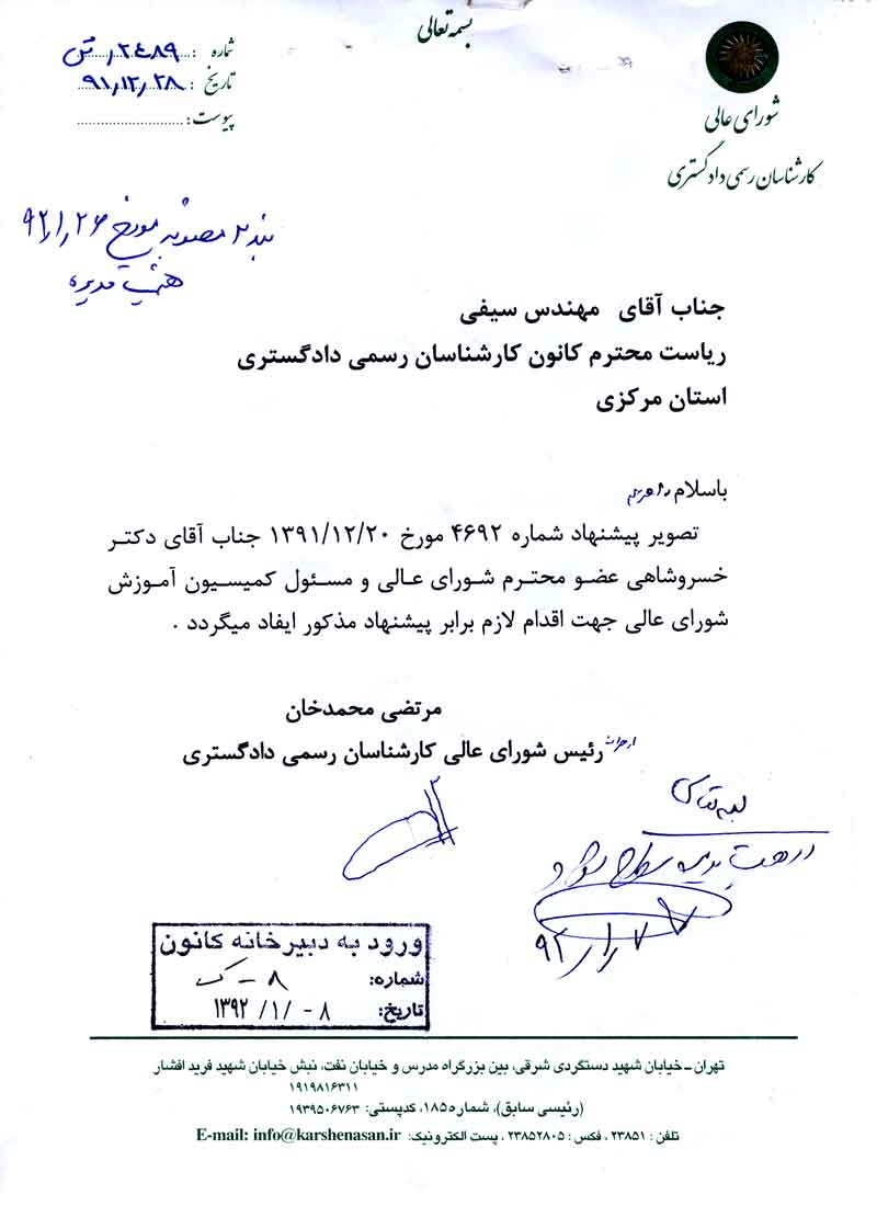 مرتضی محمدخان، رییس شورایعالی کارشناسان، در پاسخ نامه زیر را به کانون استان مرکزی ارسال نموده اند: