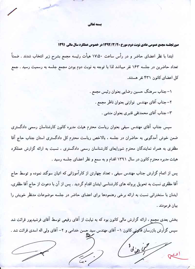 بنا به دعوت قبلی، جلسه مجمع عمومی سالانه کانون، نوبت دوم در تاریخ 92/03/20 با حضور کارشناسان عضو در سالن اجتماعات هلال احمر برگزار گردید. در این جلسه رئیس کل محترم دادگستری، جناب حجه الاسلام مظفری، نمایندگان شورای عالی، آقایان مهندسین حسن نائبی و گلشنی و اعضای هیأت مدیره حضور داشته و پس از رسمیت جلسه، با انتخاب اعضای حاضر، هیأت رئیسه مجمع به شرح زیر انتخاب شدند: