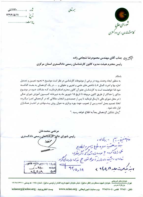 شورای عالی کارشناسان رسمی دادگستری طی نامه شماره 1120/ش مورخ 94/05/11 اعلام نموده که به منظور ایجاد وحدت رویه در خصوص “نحوه تعیین و تعدیل اجاره بها و اجرت المثل” در نظر دارد، که نسبت به برگزاری گردهمائی اقدام نماید؛ عین نامه در ذیل منتشر و با لینک قابل ملاحظه میباشد: