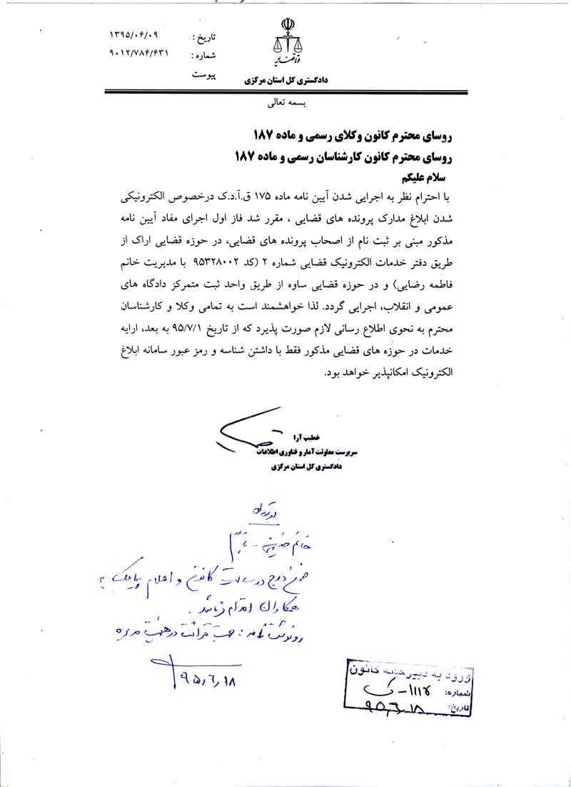 سرپرست معاونت آمار و فناوری اطلاعات دادگستری کل استان مرکزی طی نامه شماره 9012/786/631 مورخ 1395/06/09 ضمن اعلام اجرائی شدن آئین نامه ماده 175 ق.آ.د.ک. در خصوص الکترونیکی شدن ابلاغ مدارک پرونده های قضائی؛ نسبت به انجام اقدامات مربوط به ایجاد حساب کاربری و دریافت شناسه و رمز عبور تا قبل از تاریخ 95/07/01 تأکید نموده اند، که نامه مذکور جهت اطلاع و اقدام فوری عیناً در ذیل منتشر و با کلیک قابل مشاهده میباشد