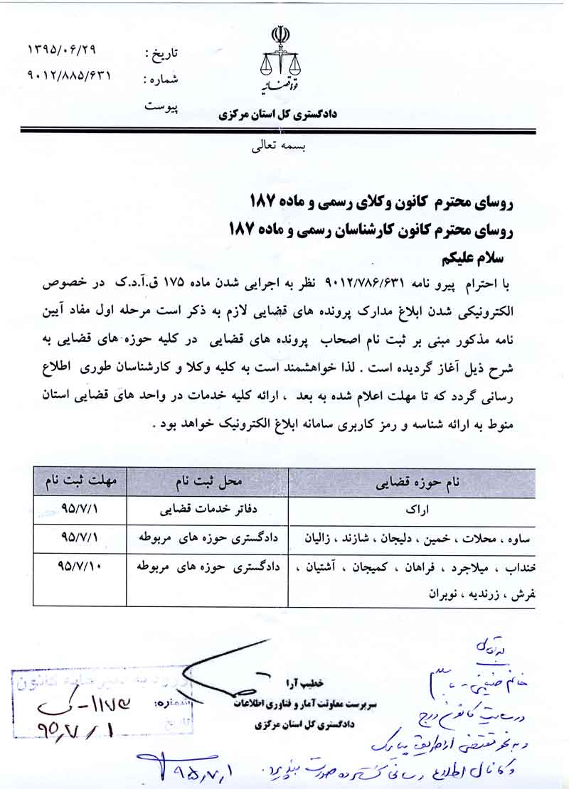 همانطور که در متن نامه قید گردیده، کلیه کارشناسان میبایست جهت ثبت نام در اراک به دفاتر خدمات قضائی و در سایر شهرستانهای سطح استان به دادگستری های حوزه های مربوطه مراجعه نمایند در انتهای نامه تأکید گردیده که من بعد ارائه کلیه خدمات در واحد های قضائی استان منوط به ارائه شناسه و رمز کاربری سامانه ابلاغ الکترونیک خواهد بود.