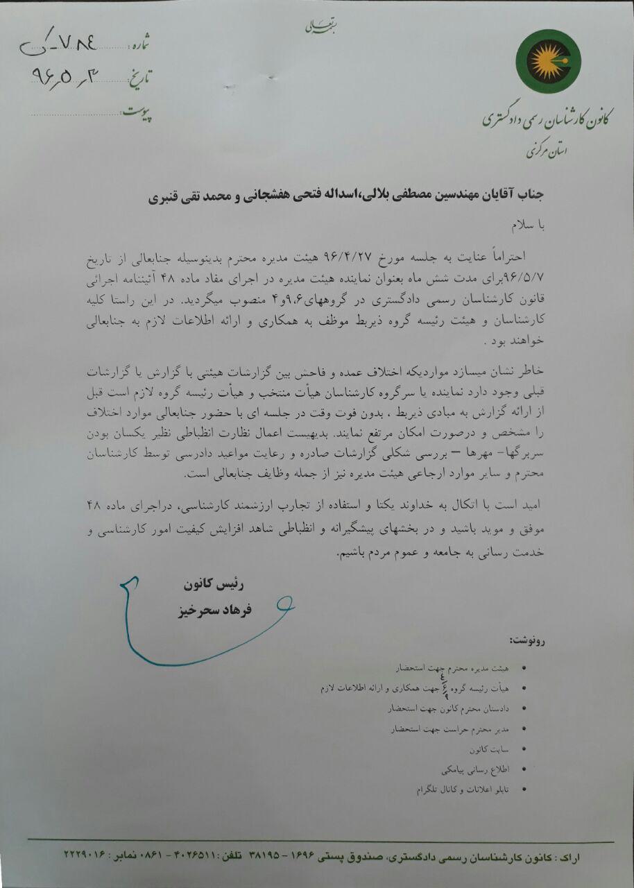 احتراماً با عنایت به جلسه مورخ 27/4/96 هیئت مدیره محترم بدینوسیله جنابعالی از تاریخ 7/5/96 برای مدت شش ماه بعنوان نماینده هیئت مدیره در اجرای مفاد ماده 48 آئیننامه اجرائی قانون کارشناسان رسمی دادگستری در گروههای 6،9و4 منصوب میگردید. در این راستا کلیه کارشناسان و هیئت رئیسه گروه ذیربط موظف به همکاری و ارائه اطلاعات لازم به جنابعالی خواهند بود.