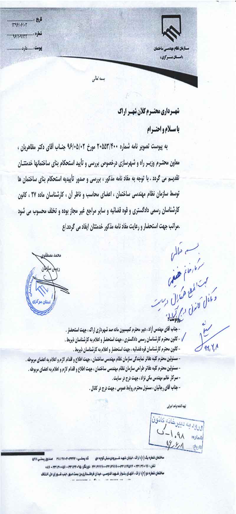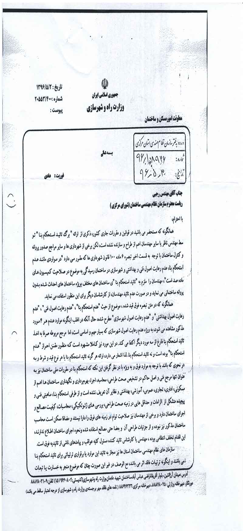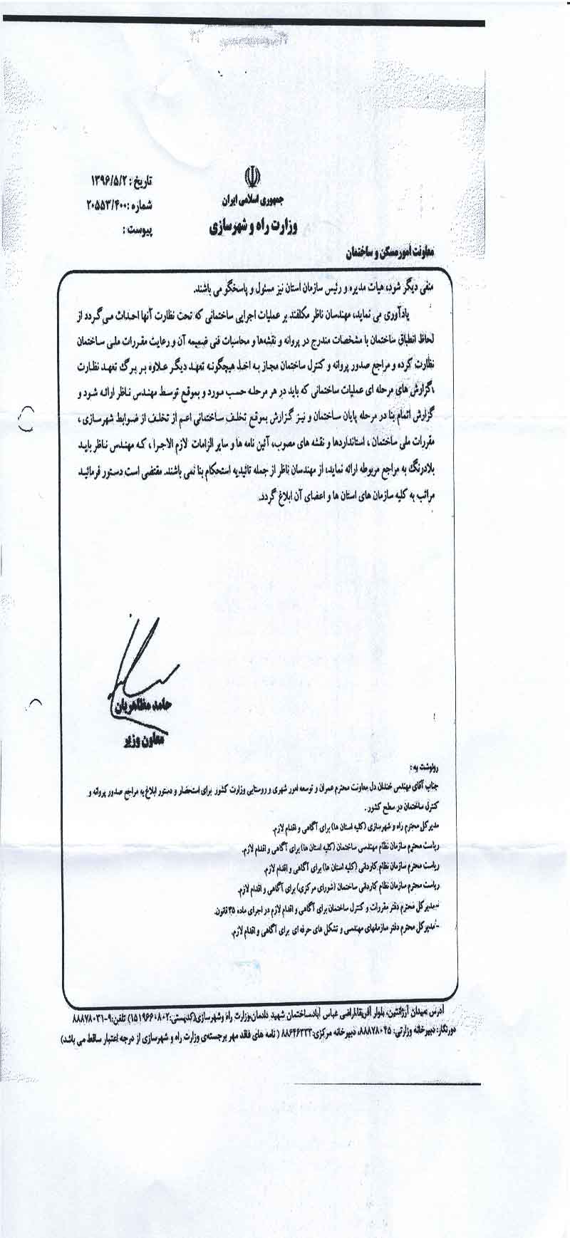 معاونت امور مسکن و ساختمان وزارت راه و شهرسازی در خصوص صدور تأییدیه استحکام بنا، نامه شماره 20553/400 مورخ 1396/05/02 را صادر نموده؛ که عیناً در ذیل منتشر و با کلیک قابل مشاهده میباشد