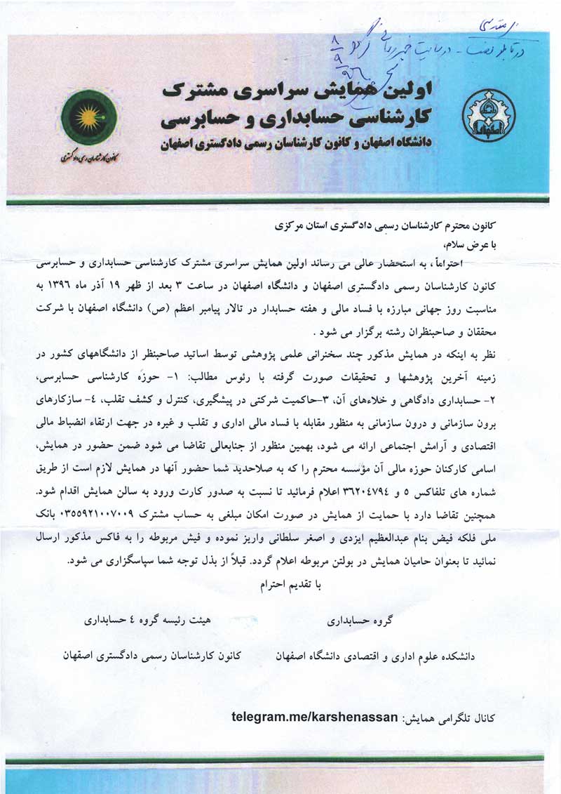 اولین همایش سراسری مشترک کارشناسی حسابداری و حسابرسی کانون کارشناسان رسمی دادگستری اصفهان و دانشگاه اصفهان در ساعت 3 بعدازظهر 1396/09/19 به مناسبت روز جهانی مبارزه با فساد مالی و هفته حسابدار در تالار پیامبر اعظم (ص) دانشگاه اصفهان با شرکت محققان و صاحبنظران رشته برگزار می شود