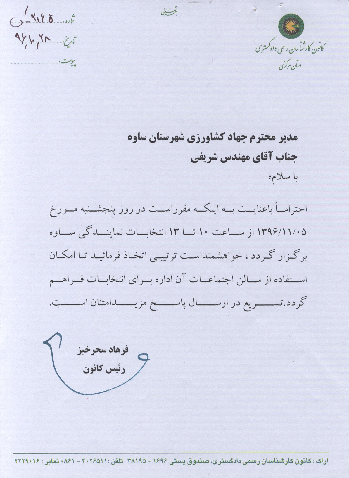 در ضمن انتخابات نمایندگی ساوه و زرندیه در تاریخ 1396/11/05 ساعت 10 تا 13 در سالن اجتماعات اداره جهاد کشاورزی شهرستان ساوه برگزار می گردد.