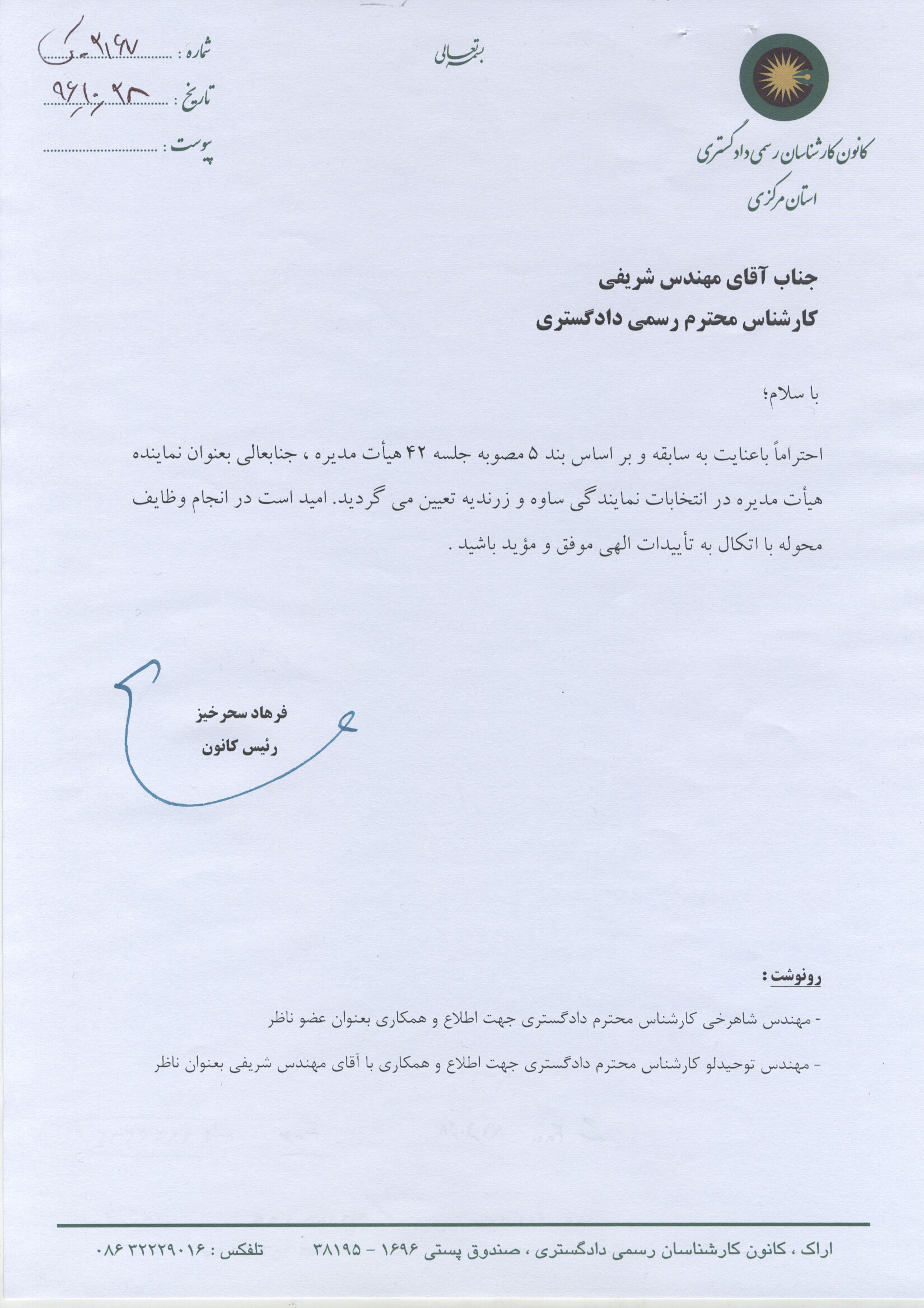 بر اساس بند 5 مصوبه جلسه 42 هیأت مدیره ، جناب آقای مهندس حسن شریفی بعنوان نماینده هیأت مدیره و همچنین ناظرین ؛ جناب آقایان مهندس سید ابوالحسن شاهرخی و مهندس جمشید توحیدلو در انتخابات نمایندگی ساوه و زرندیه تعیین شدند.