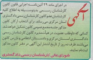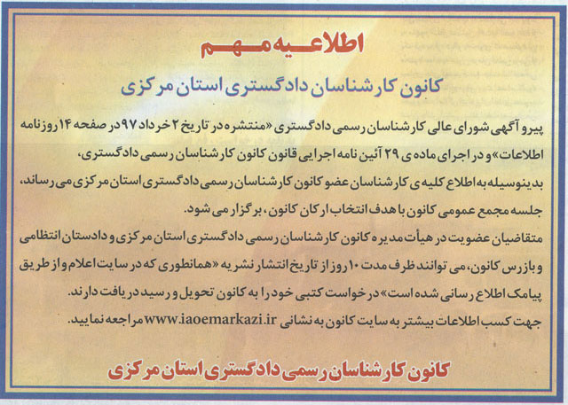 ضمن درج آگهی منتشر شده در روزنامه های اطلاعات به شماره 27010 مورخ 1397/03/02 ( صفحه 14) و عطر یاس مرکزی مورخ 1397/03/05 در خصوص انتخاب ارکان کانون،از کارشناسانی که دارای شرایط مندرج در ماده ۹ و ۱۵ قانون کانون کارشناسان رسمی دادگستری می باشند و تمایل به عضویت در ارکان کانون (هیأت مدیره، بازرسان و دادستان انتظامی کانون) را دارند، دعوت میگردد از تاریخ درج آگهی در سایت(1397/03/06) به مدت ده روزکاری(حداکثر تا پایان وقت اداری مورخ 1397/03/21 )در دفتر کانون کتباٌ ثبت نام نمایند.