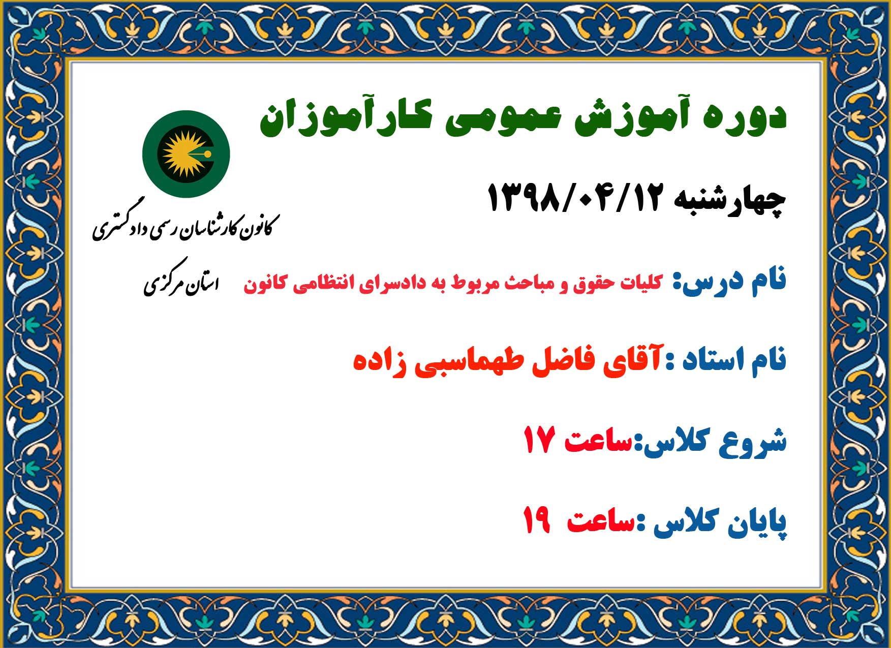 برگزاری دوره آموزشی «کلیات حقوق و مباحث مربوط به دادسرای انتظامی کانون» چهارشنبه ۱۲ تیرماه ، کانون کارشناسان رسمی دادگستری استان مرکزی (مربوط به کارآموزان آزمون سال ۹۵)