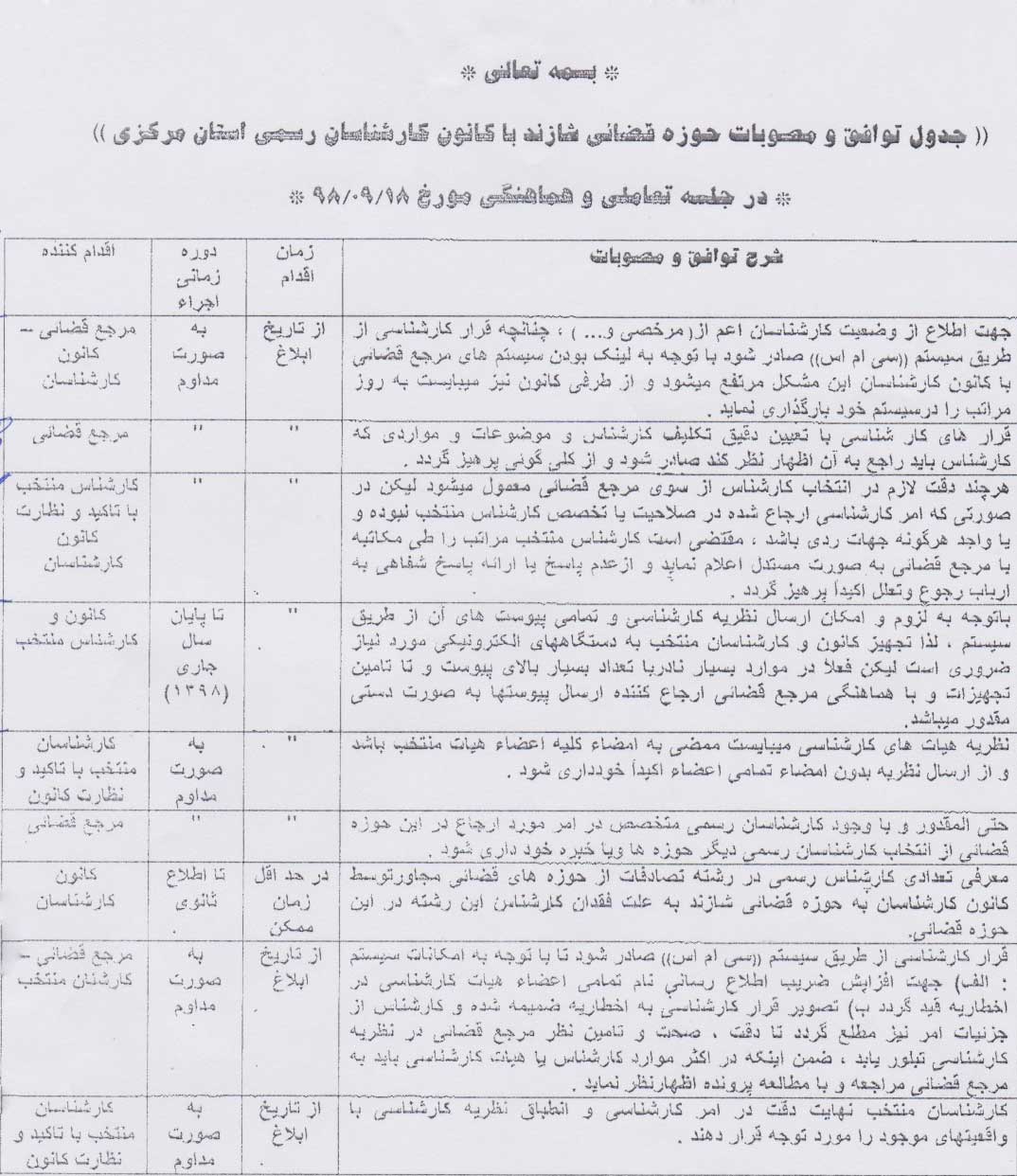 جدول توافق و مصوبات کانون کارشناسان رسمی دادگستری استان مرکزی با حوزه قضائی شهرستان شازند در جلسه تعاملی و هماهنگی مورخ (1398/09/18).