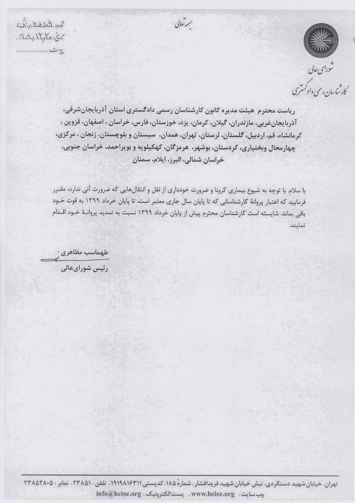 با توجه به شیوع بیماری کرونا و ضرورت خودداری از نقل و انتقال هایی که ضرورت آنی ندارد، مقرر شد که اعتبار پروانه کارشناسانی که تا پایان سال جاری(98) معتبر است، تا پایان خرداد 1399 به قوت خود باقی بماند.شایسته است کارشناسان محترم پیش از پایان خرداد 1399 نسبت به تمدید پروانه خود اقدام نمایند.