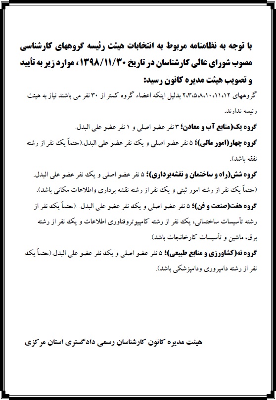 *جهت مشاهده نظامنامه مربوط به انتخابات هیئت رئیسه گروههای کارشناسی روی لینک ذیل کلیک نمایید..