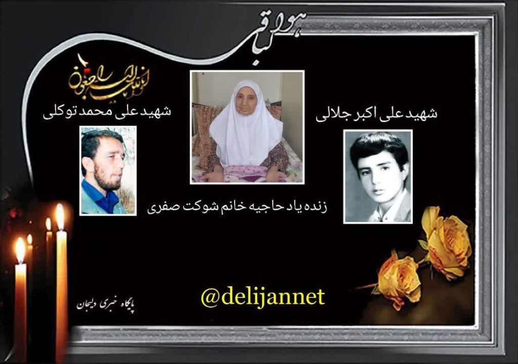 درگذشت حاجیه خانم شوکت صفری مادر شهید والامقام علی اکبر جلالی و مادر همسر شهید والامقام علی محمد توکلی و مادر گرامی آقای مهندس محمد جلالی “نماینده محترم مردم شریف شهرستانهای محلات و دلیجان در مجلس شورای اسلامی” را به خانواده های داغدار تسلیت عرض مینمائیم .