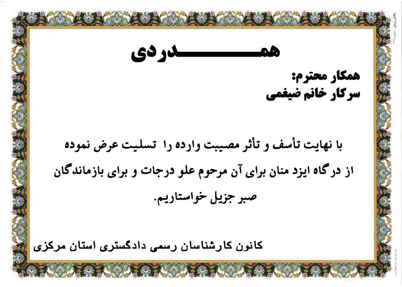 - اعلام تسلیت و همدردی با جناب آقای علی عباسی کارشناس رسمی دادگستری در رشته نساجی و رنگرزی. ۱ آذر ۱۴۰۴