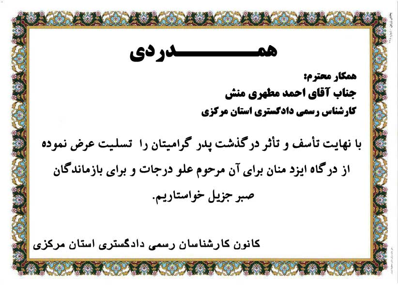 - اعلام تسلیت و همدردی با جناب آقای احمد مطهری منش کارشناس رشته امور حمل و نقل (ترابری) ۲ اسفند ۱۴۰۴